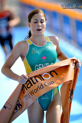 So - onto Semi-Final 1! The swim was 750m, requiring 3(!) laps in somewhat murky water. Given that the first buoy was a ‘generous’ 114 metres from the start line, most were predicting blood at the first turn, evident by the 1st aid officers, paramedics, and most unsettlingly, a priest situated by the swim course. Choosing to give the rest of the field a fighting chance, Gentle (by her own admission) had a dog’s breakfast of a start, and did everything but swim backwards from the start line. Head-start given, some strong swimming and tactical nous, saw Gentle enter T1 nothing more than a few firm pedal strokes from the front bunch, after which the bike ensued without incident, and a large pack arrived at T2.